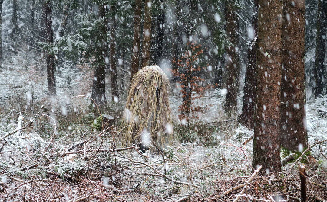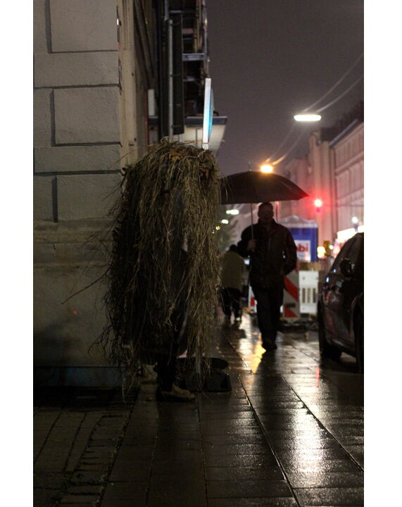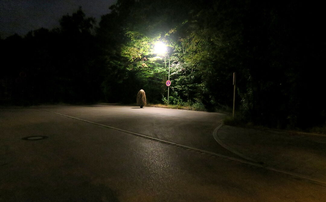 „Verloren wirkt dieser kleine Strohhaufen, wie er da versucht über die Straße zu kommen. Zögernd setzt er einen Fuß über die Bordsteinkante, um ihn sofort wieder zurückzuziehen. Es ist dunkel, es regnet, und der Fluß der Autos ist gnadenlos. Keine Chance ür das selstame Wesen auf zwei Beinen das da im Feierabendverkehr irrlichtert, als hätte ein sadistischer Gott es dort ausgesetzt. Man weiß nicht recht, ob man die zerzauste Kreatur niedlich oder unheimlich finden soll (...). Mal stapft das Geschöpf zwischen den Pfeilern einer Straßenbrücke, mal treibt es sich bei den Stämmen eines Holzlagers herum oder durchquert bei dichte, Schneetreiben einen Wald. Wie ein Tier, das auf der Hut ist, beobachtet von einem Jäger? Oder einem Naturfilmer? Von uns? Das Auge einer sehr stillen Kamera jedenfalls wahrt stets wohlwollende Distanz. „Es ist dieses unerforschte Wesen, dem ich versuche, nahezukommen, und das mir immer wieder entwischt“, sagt Judith Egger über ihre aktuelle Ausstellung „Lauschen und Lauern“. Seit Jahren betreibt die Münchner Künstlerin Feld- und Tiefseelenforschung, um auf etwas zu stoßen, das viele Namen hat: das Unkontrollierbare, Unkalkulierbare, Unbekannte, Unbeherrschte.