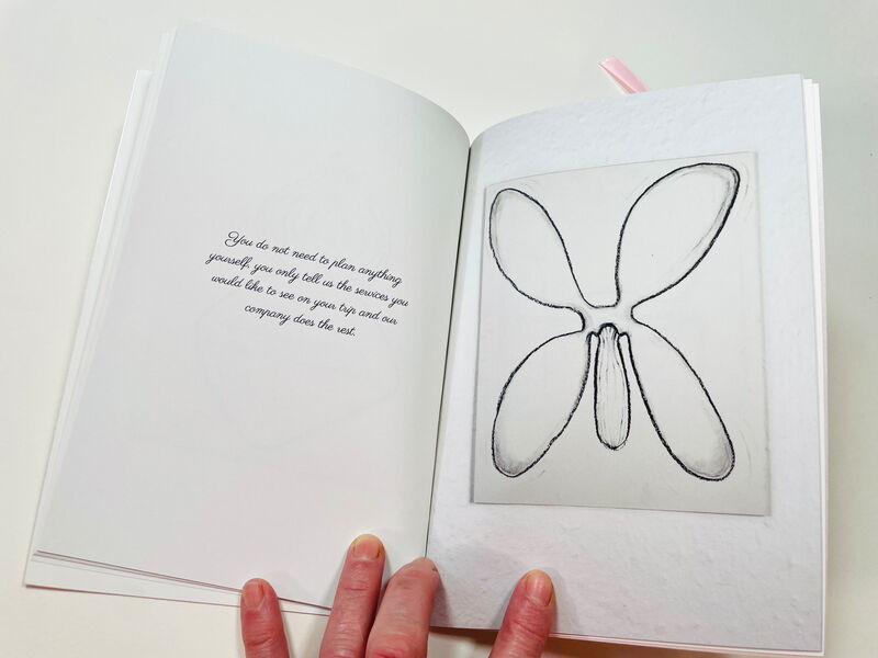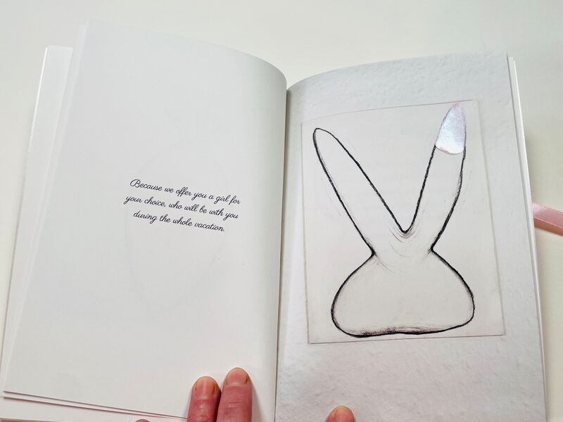 Das Heft erscheint in einer nummerierten Auflage von 49 Stück, wird von einem Satinband umfasst und enthält an überraschender Stelle je ein Zeichnungs-Präservativ aus Seidenpapier und Nagellack in metallic-rosé.